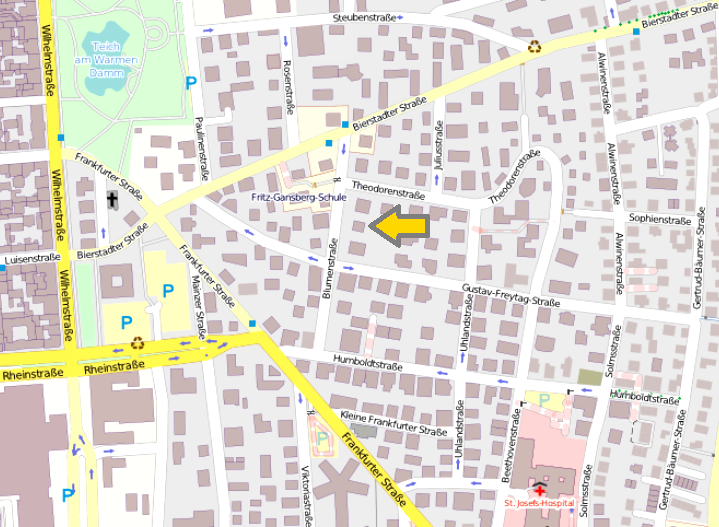 Zur Blumenstraße gelangen Sie am besten über die Bierstadter Straße. Das Haus Nr. 6 bedindet sich zwischen der Theodorenstraße und der Gustav-Freytag-Straße. Auf dem Grundstück vor dem Haus sind ausreichend Parkmöglichkeiten vorhanden.